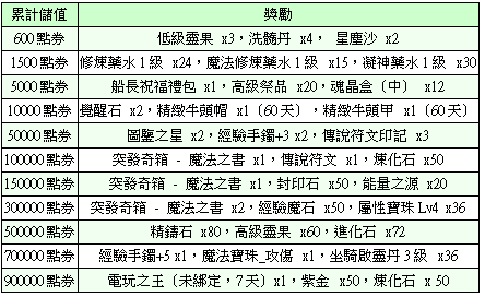 活動描述:活動期間,玩家每儲值一定數額的點券即可獲得超值獎勵!!一次性儲值獎勵可重複領取。
