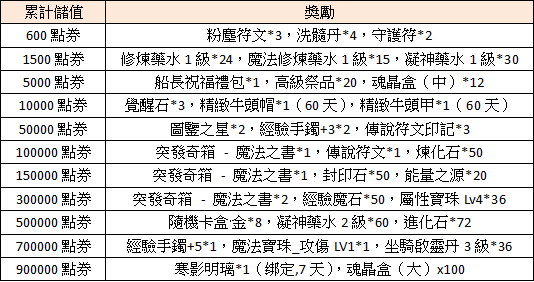 活動描述:活動期間,玩家每儲值一定數額的點券即可獲得超值獎勵!!一次性儲值獎勵可重複領取。