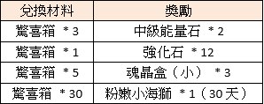 活動規則:活動期間,可使用指定物品兌換獎勵
