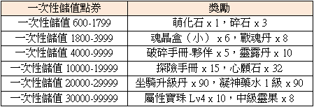 活動描述:活動期間,玩家每儲值一定數額的點券即可獲得超值獎勵!!一次性儲值獎勵可重複領取。