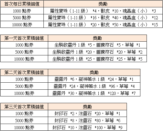 2、首次每日累積儲值獎勵請在儲值當日於專屬活動面版領取,當日未領視同放棄。