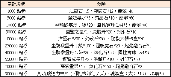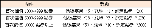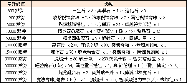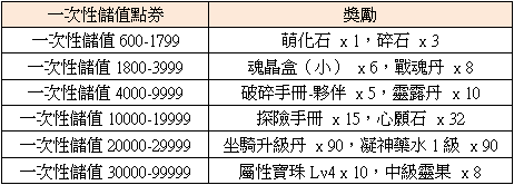 活動描述:活動期間,玩家每儲值一定數額的點券即可獲得超值獎勵!!一次性儲值獎勵可重複領取。