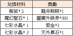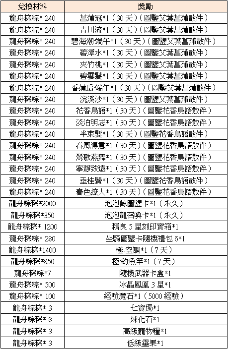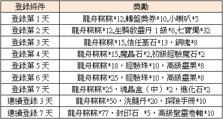 活動獎勵:龍舟粽粽*15,高級寵物糧*10,黑曜石*15,七寶燭*6,啟靈珠碎片*15