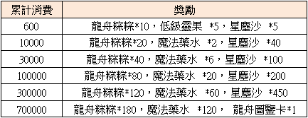 活動獎勵:龍舟粽粽*15,初級經驗魔石*6,坐騎啟靈丹1級 *12,星塵沙 *9