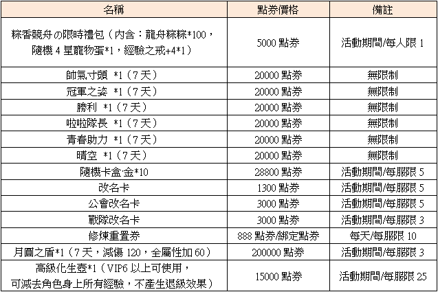 活動描述:活動期間,使用指定物品即可兌換超值獎勵,商城上架 龍舟粽粽:100點券/1個。