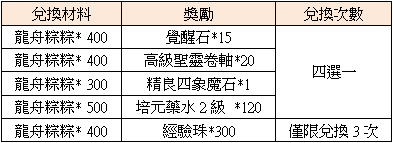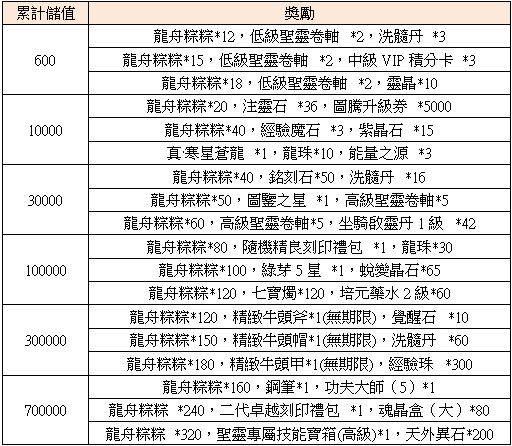 活動獎勵:龍舟粽粽*15,經驗珠*7,坐騎啟靈丹1級 *12,星塵沙 *9