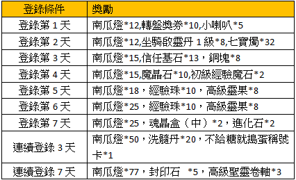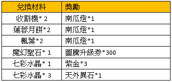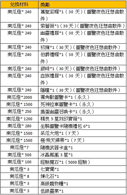 活動獎勵:南瓜燈*15,高級寵物糧*10,黑曜石*10,七寶燭*6,啟靈珠碎片*15,銘刻石*3,Lv.1樂園門票*1