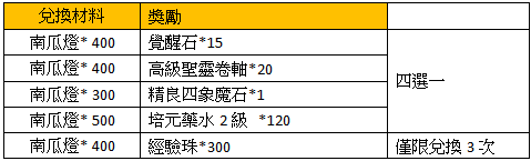 活動獎勵:南瓜燈*15,經驗珠*7,坐騎啟靈丹1級 *10,星塵沙 *9,蛻變晶石*2