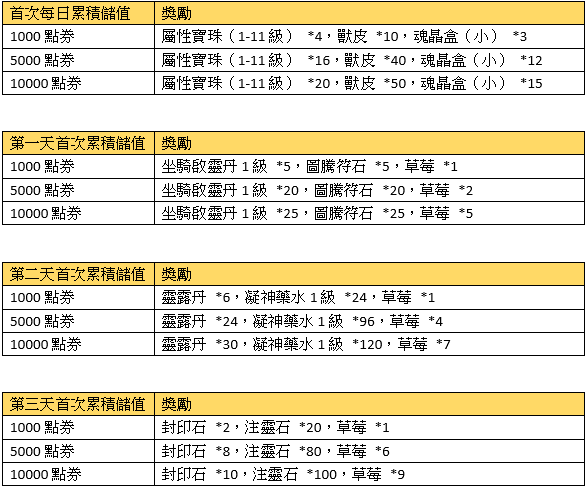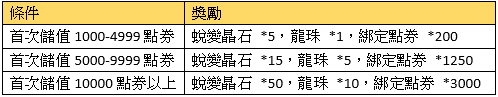 2、首次每日累積儲值獎勵請在儲值當日於專屬活動面版領取,當日未領視同放棄。