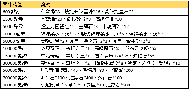 活動描述:瘋狂連續儲值拿大獎!!獎勵價值大於15萬!!
