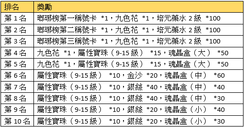 活動描述:活動結束時,彈友們只要在遊戲中累計儲值達到前十名就可以獲得額外獎勵喔。