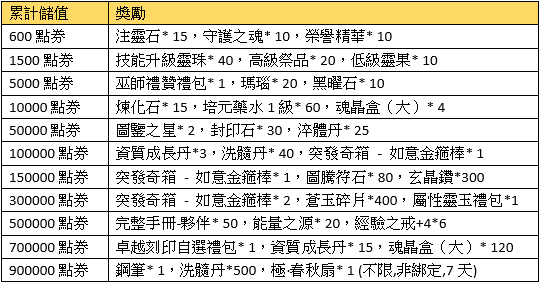 活動描述:瘋狂連續儲值拿大獎!!獎勵價值大於15萬!!