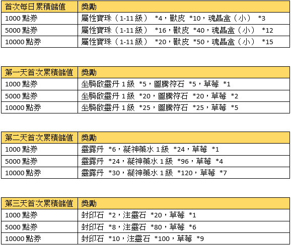 2、首次每日累積儲值獎勵請在儲值當日於專屬活動面版領取,當日未領視同放棄。