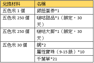 活動描述:活動期間,彈友們可以用五色米兌換超萌套裝喔~五色米不夠的彈友們,可在彈彈搶購購買,100點券/個