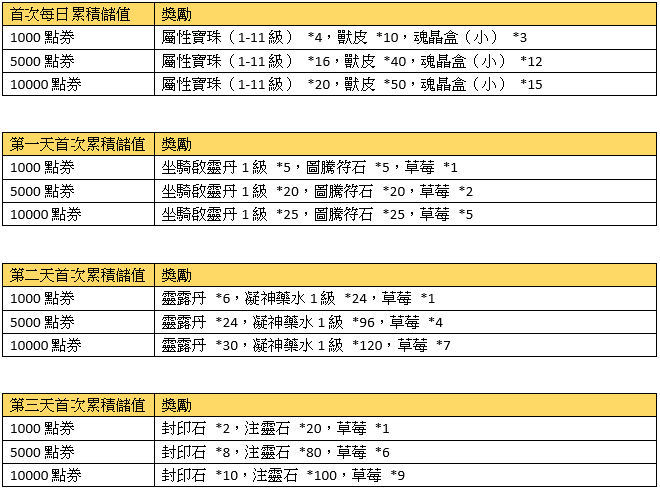 2、首次每日累積儲值獎勵請在儲值當日於專屬活動面版領取,當日未領視同放棄。