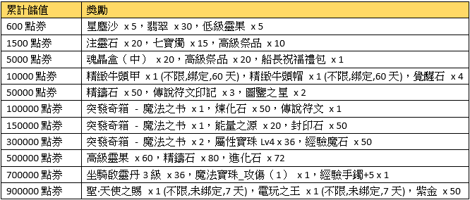活動描述:活動期間,玩家每儲值一定數額的點券即可獲得超值獎勵!!一次性儲值獎勵可重複領取。
