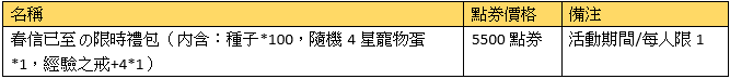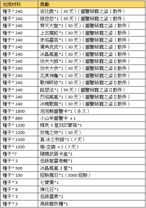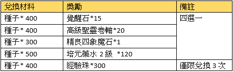 活動描述:活動期間,使用指定物品即可兌換超值獎勵,商城上架 種子:100點券/1個。