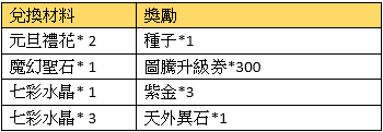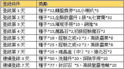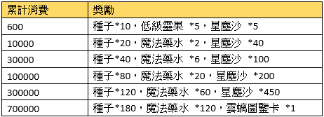 活動獎勵:種子*15,高級寵物糧*10,黑曜石*10,七寶燭*6,啟靈珠碎片*15,銘刻石*3,Lv.1樂園門票*1