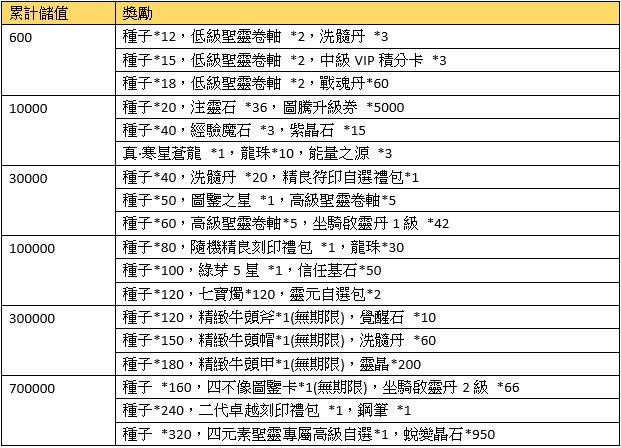 充值獎勵:極·白領戰士*1(7天)、魔法修煉藥水2級*30、培元藥水2級 *20、高級聖靈卷軸*1、戰魂丹*50、種子*60
