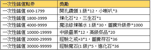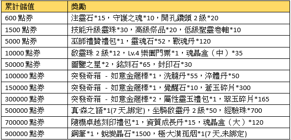 活動描述:活動期間,玩家每儲值一定數額的點券即可獲得超值獎勵!!一次性儲值獎勵可重複領取。
