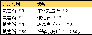 活動規則:活動期間,可使用指定物品兌換獎勵
