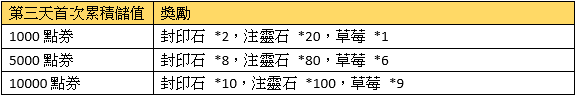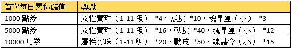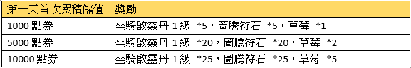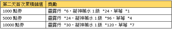 2、首次每日累積儲值獎勵請在儲值當日於專屬活動面版領取,當日未領視同放棄。