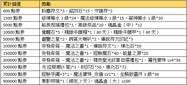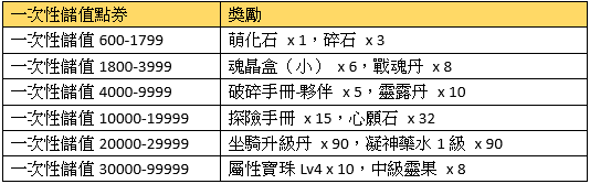 活動描述:活動期間,玩家每儲值一定數額的點券即可獲得超值獎勵!!一次性儲值獎勵可重複領取。