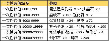 活動描述:活動期間,玩家每儲值一定數額的點券即可獲得超值獎勵!!一次性儲值獎勵可重複領取。