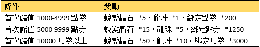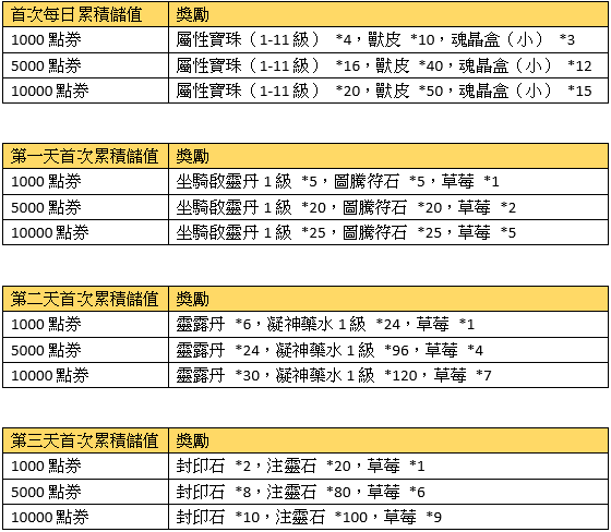 2、首次每日累積儲值獎勵請在儲值當日於專屬活動面版領取,當日未領視同放棄。