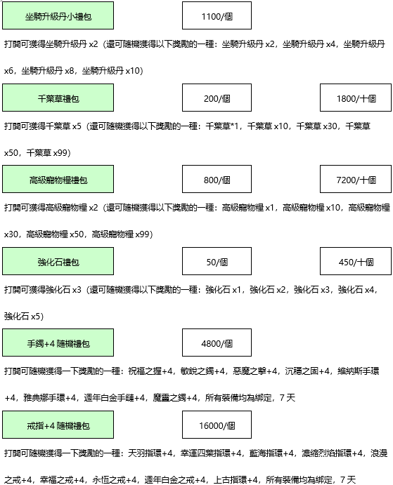 4、活動獎勵物品,每項僅可領取一次,若無特殊註明均為綁定物品;