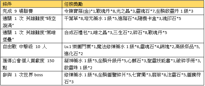 1、每個玩家每天可完成一次活動任務,不同任務的獎勵均可獲得一次;