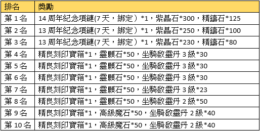 活動描述:活動結束時,彈友們只要在遊戲中累計儲值達到前十名就可以獲得額外獎勵喔。