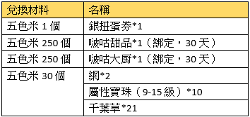 活動描述:活動期間,彈友們可以用五色米兌換超萌套裝喔~五色米不夠的彈友們,可在彈彈搶購購買,100點券/個