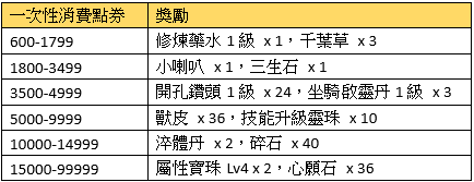 活動描述:活動期間,玩家每儲值一定數額的點券即可獲得超值獎勵!!一次性儲值獎勵可重複領取。