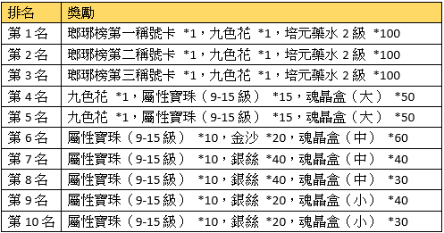 活動描述:活動結束時,彈友們只要在遊戲中累計儲值達到前十名就可以獲得額外獎勵喔。