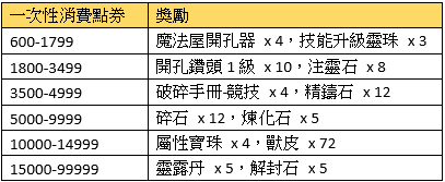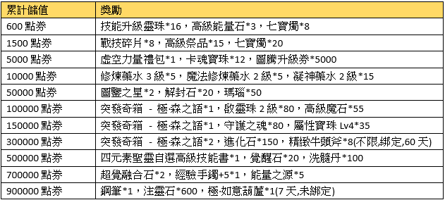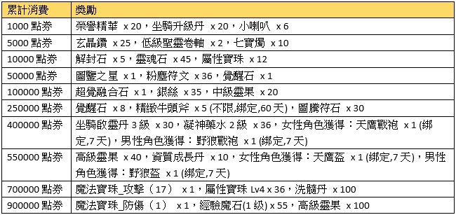 活動描述:活動期間,玩家每儲值一定數額的點券即可獲得超值獎勵!!一次性儲值獎勵可重複領取。