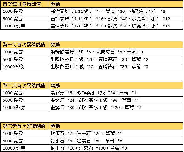 3、累日首次累積儲值獎勵請在活動結束前於專屬活動面版領取,逾期未領者視同放棄。