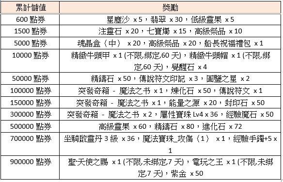 活動描述:瘋狂連續儲值拿大獎!!獎勵價值大於15萬!!