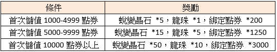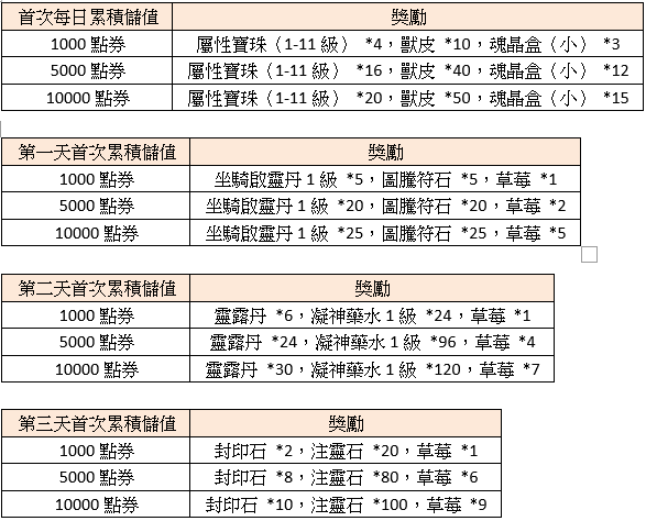 2、首次每日累積儲值獎勵請在儲值當日於專屬活動面版領取,當日未領視同放棄。