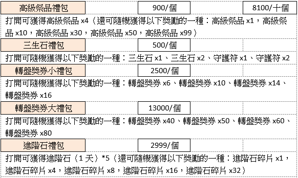 活動獎勵:使用轉盤後可以獲得不同儲值返比,在活動期間內儲值即可獲得額外贈送的點券,只要參與即可獲得:輪盤驚喜包*1
