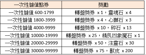 1、一次性儲值可以重複領取;若欲領取特定階段的一次性儲值獎勵,請保持在線儲值;離線儲值將導致儲值金額於下次上線時合併計算