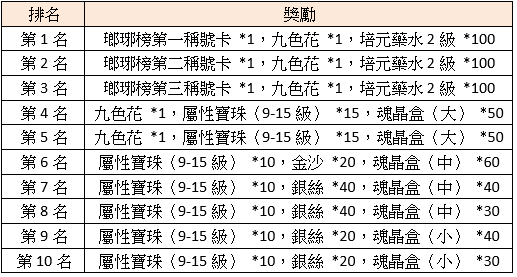 活動描述:活動結束時,彈友們只要在遊戲中累計儲值達到前十名就可以獲得額外獎勵喔。