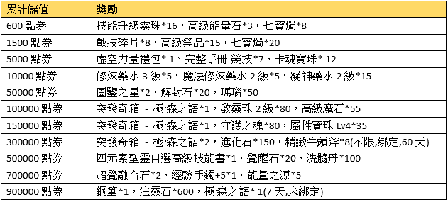 活動描述:活動期間,玩家每儲值一定數額的點券即可獲得超值獎勵!!一次性儲值獎勵可重複領取。