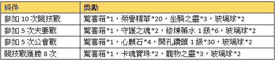 活動描述:活動期間,參加各種競技戰,只要你夠努力和強悍,任務獎勵隨你拿去。
