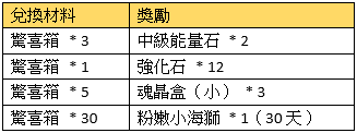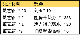 活動規則:活動期間,可使用指定物品兌換獎勵