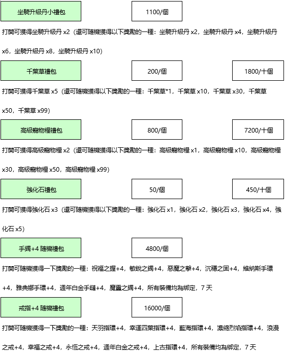 4、活動獎勵物品,每項僅可領取一次,若無特殊註明均為綁定物品;