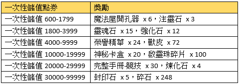 1、一次性儲值可以重複領取;若欲領取特定階段的一次性儲值獎勵,請保持在線儲值;離線儲值將導致儲值金額於下次上線時合併計算