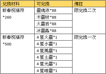 活動獎勵:新春祝福符*6,進階石*2,高級祭品*5,魂晶盒(小)*5,破碎手冊*5,銘刻石*3