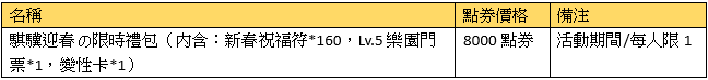 活動獎勵:新春祝福符*14,超級幸運符*2,白銀探險家手冊*1,情意綿綿*4,粉紅冬戀*1(all5,30天),藍色冬戀*1(all5,30天),合成石禮包*20