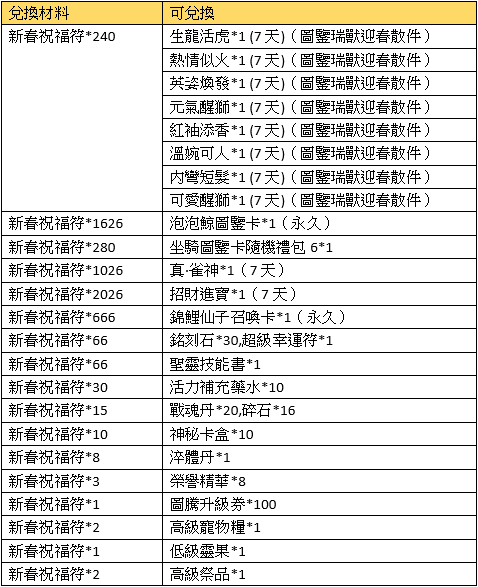 活動獎勵:新春祝福符*6,光之晶*2,魔法修煉藥水1級*5,獸皮*8,千葉草*8,進化石*3